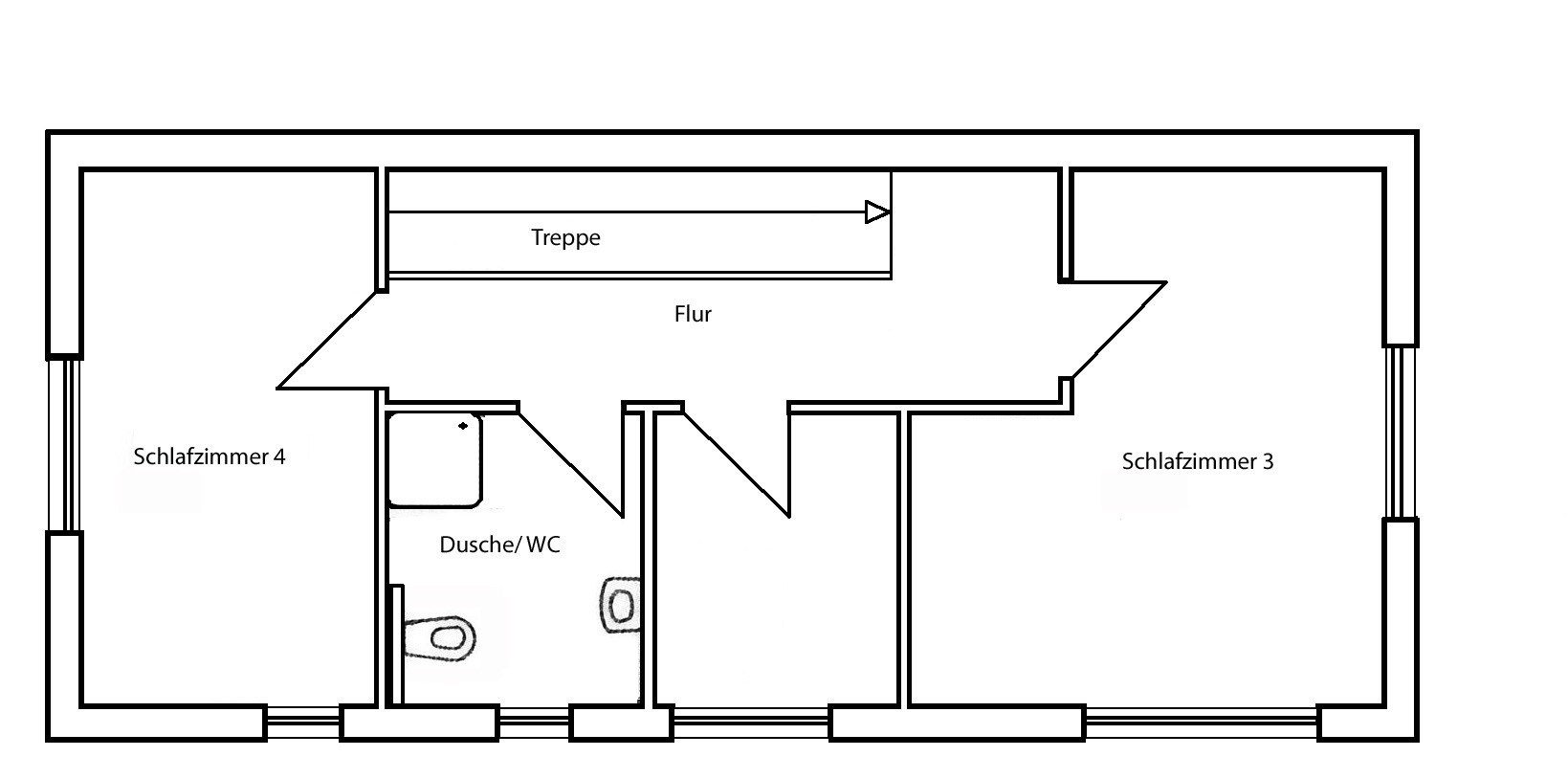 Der Flur und das Badezimmer im Obergeschoss sind gefliest, die Schlafräume sind mit Laminat ausgelegt. Sie können das Obergeschoss nutzen, wenn Sie mit fünf Personen oder mehr anreisen. Alle Schlafzimmer können als Einzelzimmer gebucht werden.